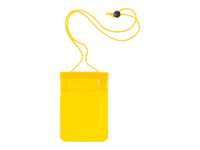 Coloured plastic, waterproof mobile phone case with neck strap. Ideal for touch screen phones.