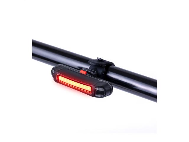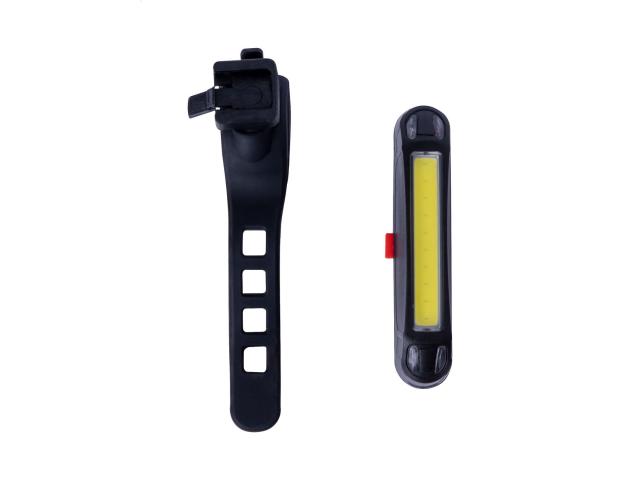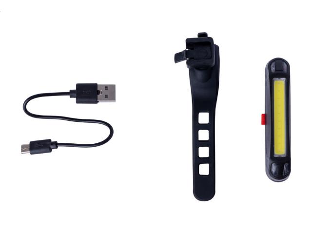 ABS plastic bicycle light with high power COB floodlight (white and red light), built-in USB rechargeable battery (350 mAh) and elastic strap. With fixed and flashing light modes. Including USB charger cable. Not merchandised in the following countries: DE, AT, CH.