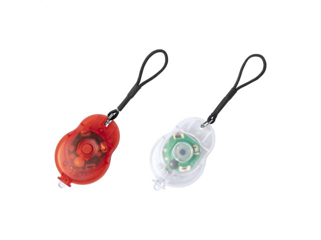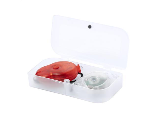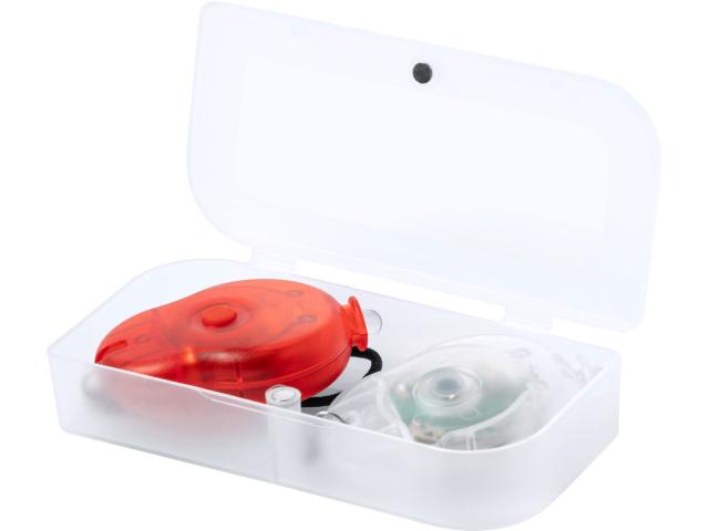 2 pc bicycle light set in PP plastic case. Includes 1 white and 1 red LED light with elastic straps and 2 light modes. With 2 button cell batteries.