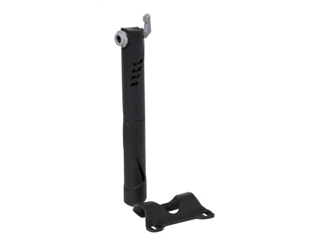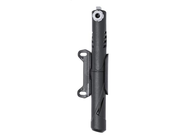 Mini bicycle hand pump with frame-mounted holder.