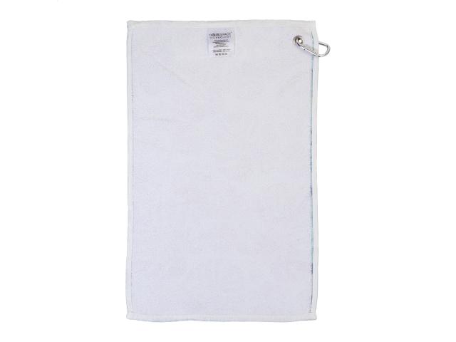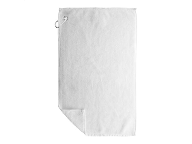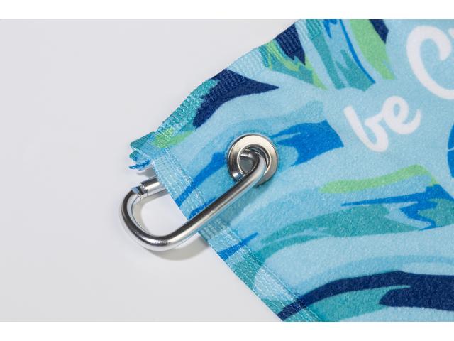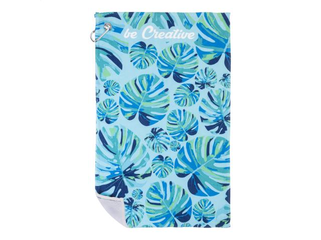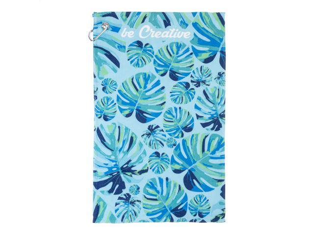Double face golf towel with metal hanger and sublimation printed graphics on one side. 100% cotton + 100% microfibre, 400 g/m². Price includes sublimation printing. MOQ: 50 pcs.