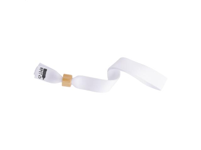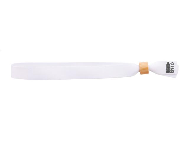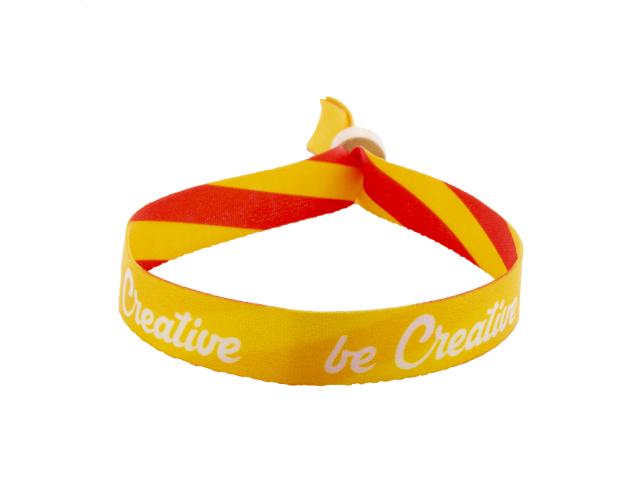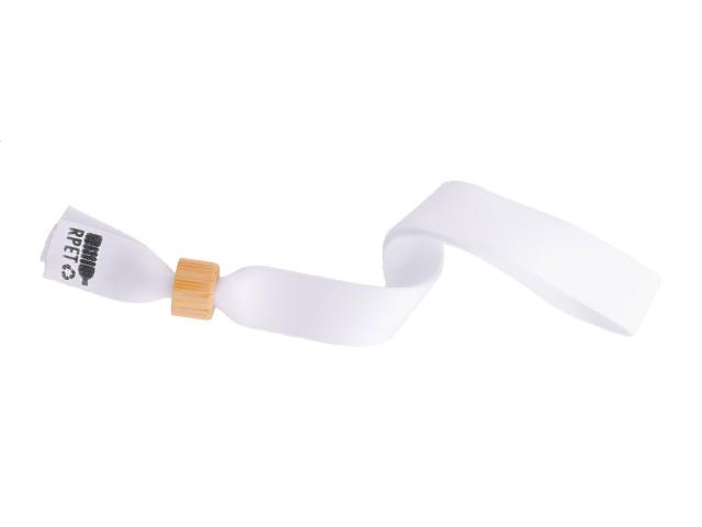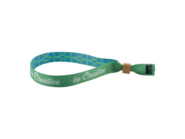 Custom made, RPET polyester festival bracelet with bamboo safety lock. With sublimation printed graphics on both sides. MOQ: 100 pcs.