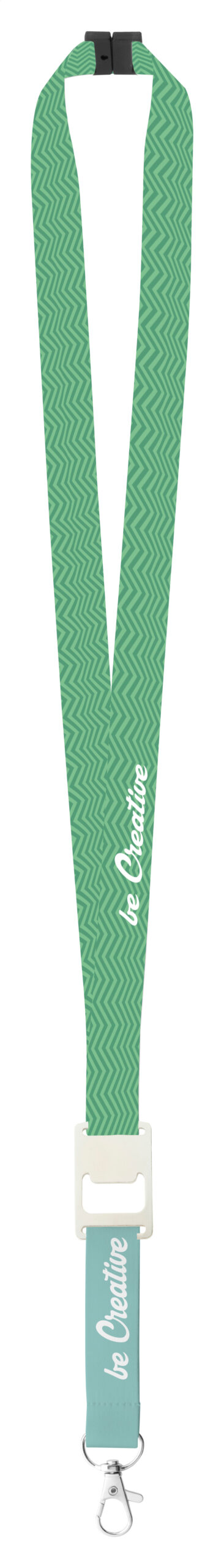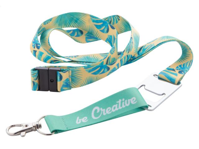 Custom made, polyester lanyard with metal carabiner, bottle opener and safety buckle. With sublimation printed graphics on both sides. MOQ: 100 pcs.