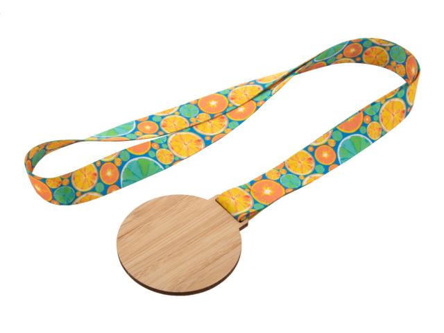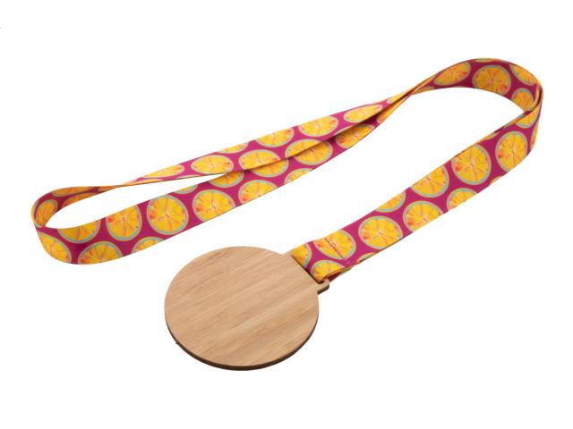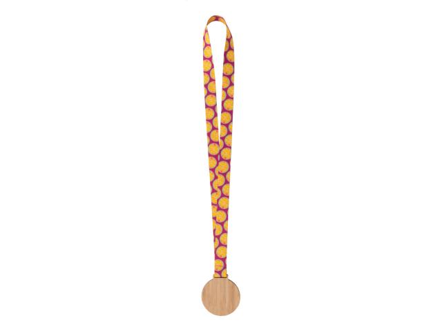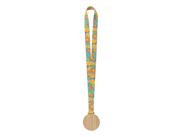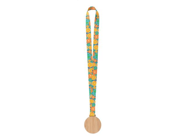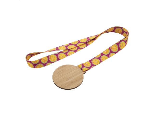 Custom made, bamboo medal on sublimation printed RPET lanyard. Price includes sublimation printing. MOQ: 100 pcs.