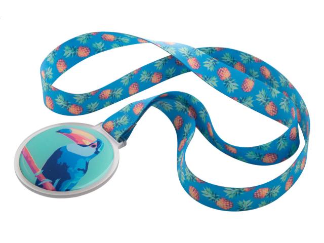 Custom made, acrylic medal with epoxy dome. On sublimation printed polyester lanyard. Price includes sublimation and epoxy doming. MOQ: 100 pcs.