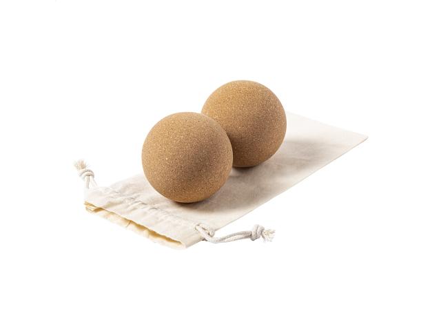 2 pc natural cork massage ball set in cotton pouch. They allow to self-massage and release tension in tight muscles and hard to reach places.