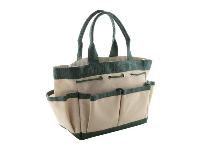 Garden tools set in nylon organizer bag. Including pruning scissors, hand fork, 2 trowels, binding wire with cutter, sprayer and a pair of gloves.