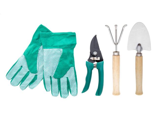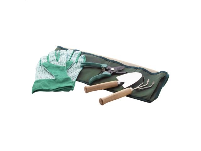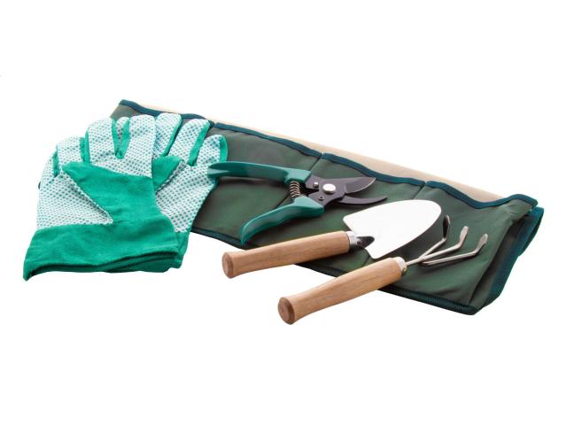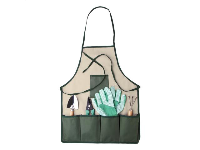 Garden tools set in nylon apron. Including pruning scissors, hand fork, trowel and a pair of gloves.