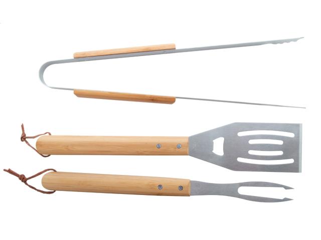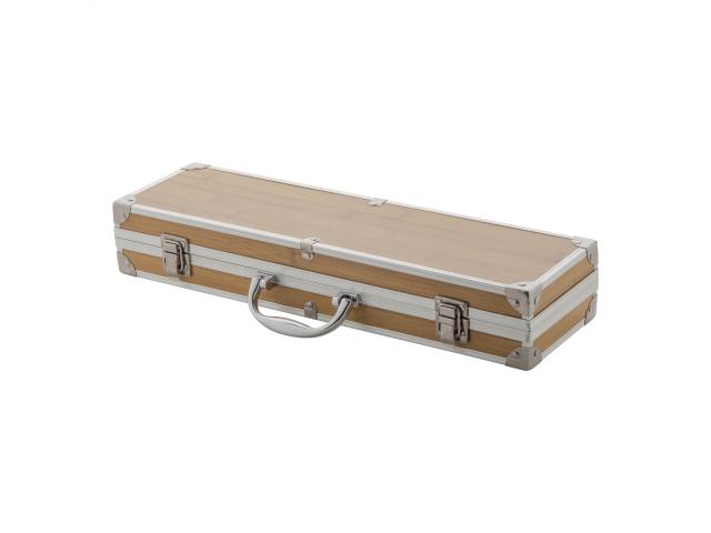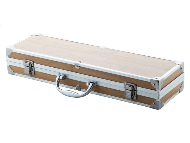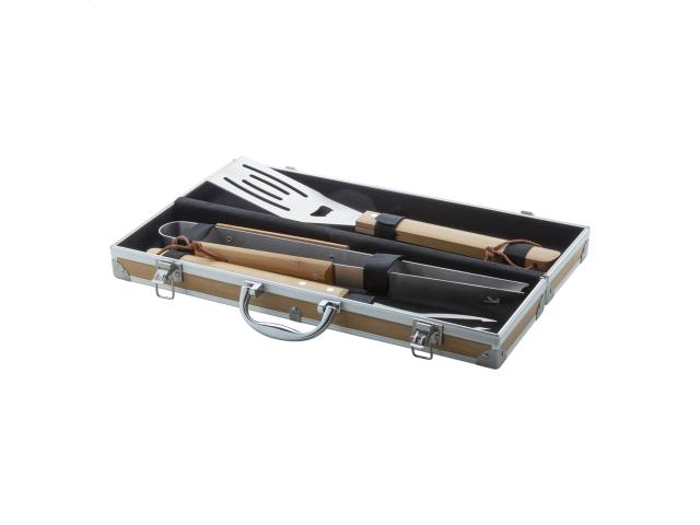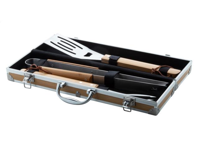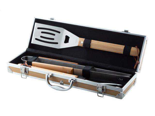 3 pc stainless steel, bamboo handle barbecue set (fork, clip and shovel with bottle opener). In bamboo patterned aluminium case.