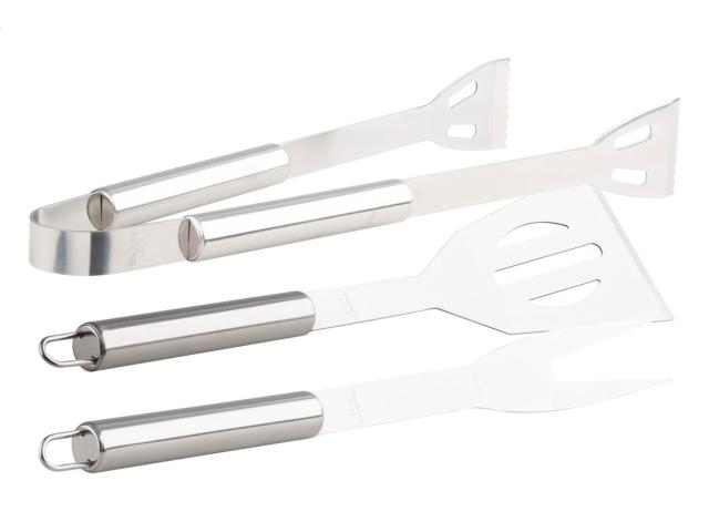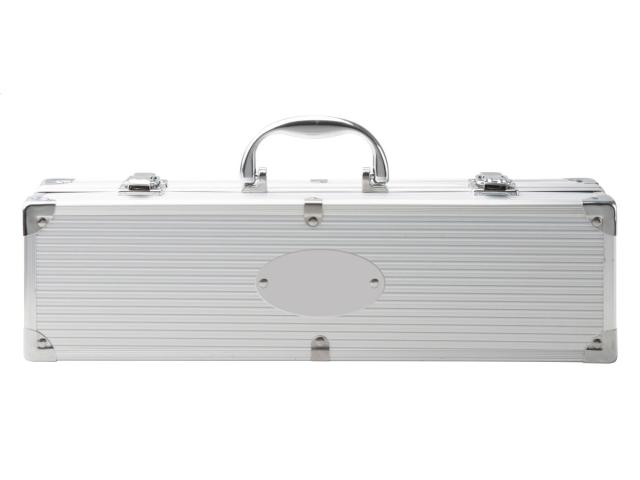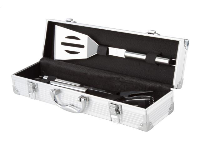 3 pc stainless steel barbecue set (fork, shovel and clip) in aluminium case.