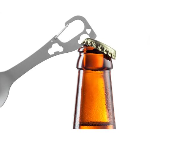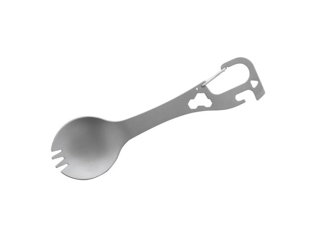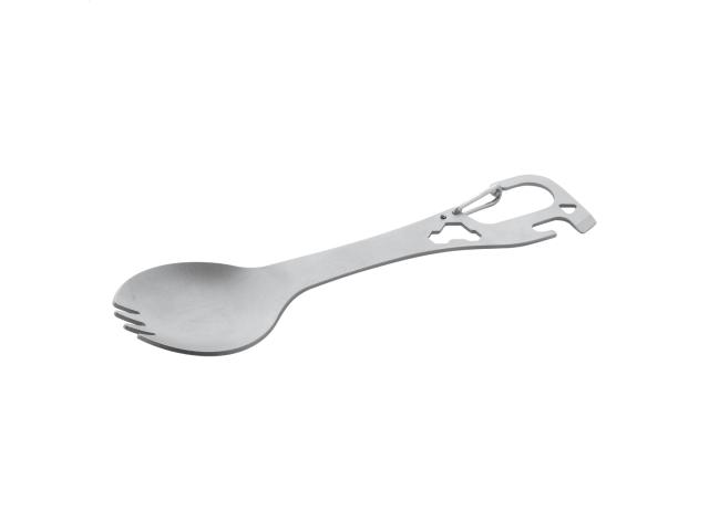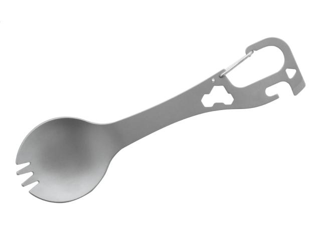 Stainless steel cutlery (spoon and fork) multi tool with carabiner.