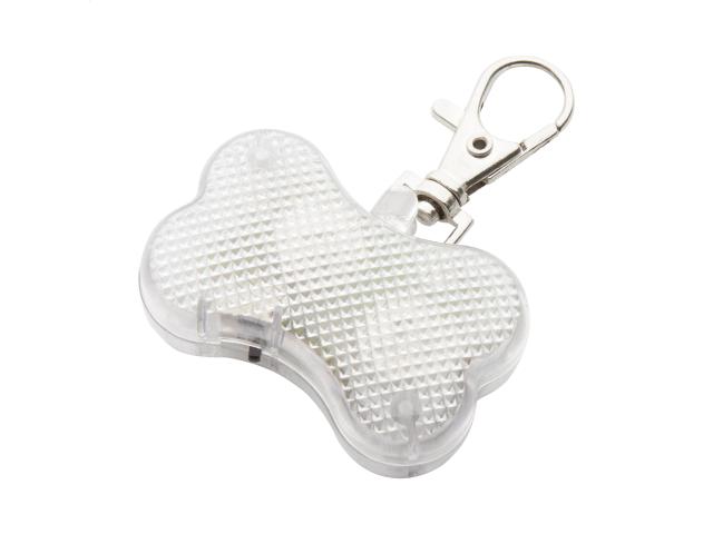 Bone shaped pet safety light with flashing LED lights. With button cell batteries.