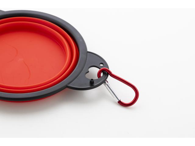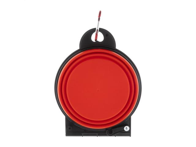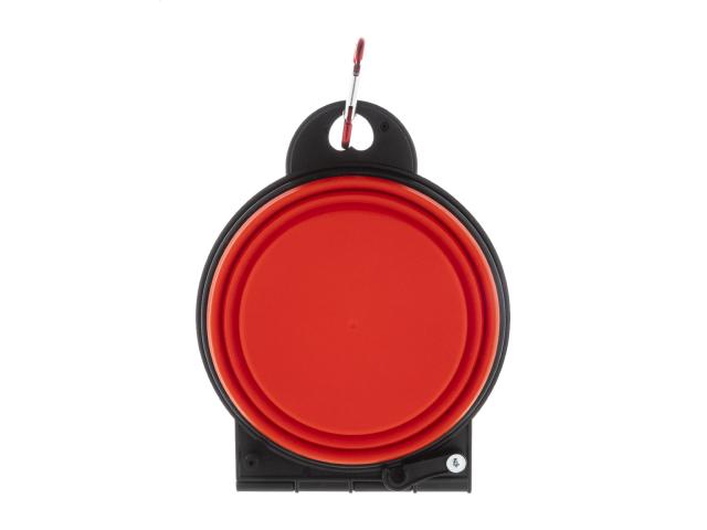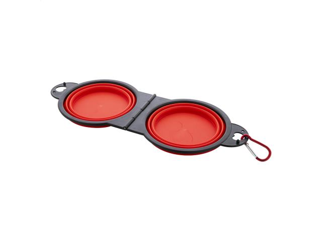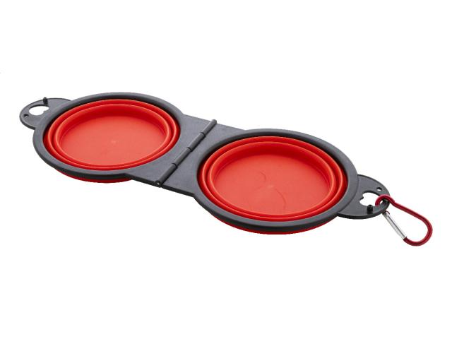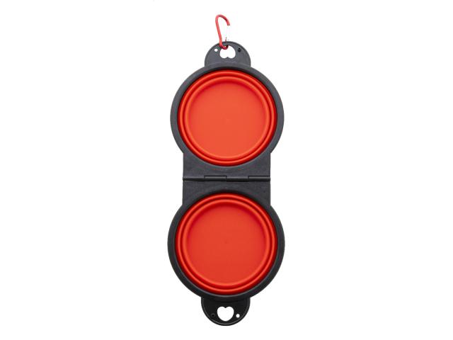 Foldable pet bowl in durable TPE with two 450 ml compartments and matching colour carabiner.