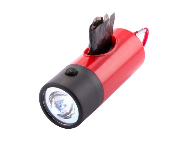 Plastic dog waste bag dispenser with 1 LED flashlight, 15 bags and aluminium carabiner. With button cell batteries.