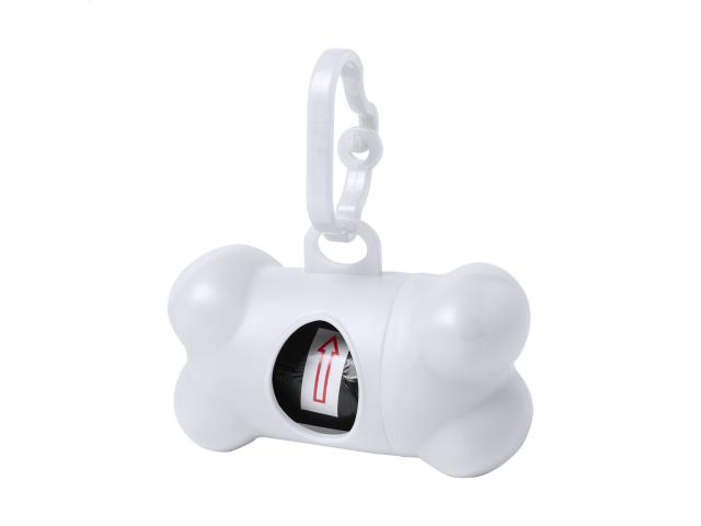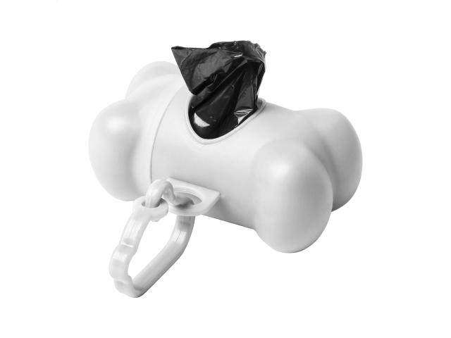 Plastic, bone shaped dog waste bag dispenser with carabiner and 15 bags.
