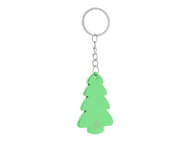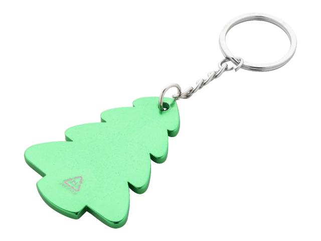 Christmas tree shaped recycled aluminium keyring with metal ring.