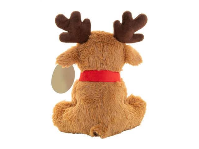 RPET plush Christmas reindeer with scarf. With printable kraft paper hang tag on its ear.