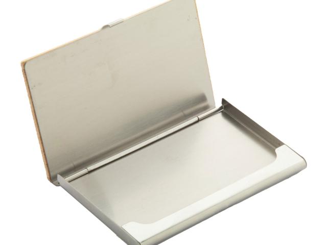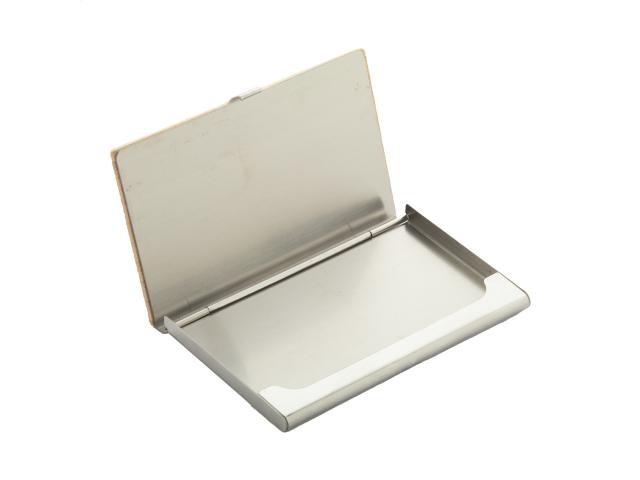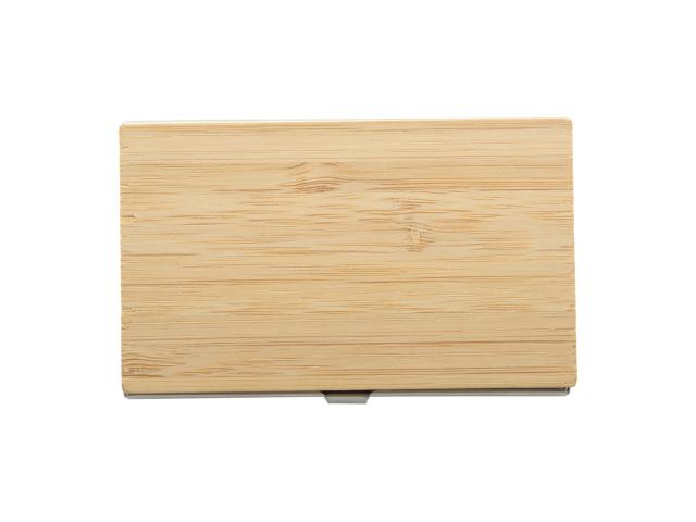 Bamboo covered metal business card holder.
