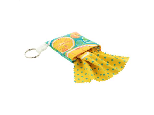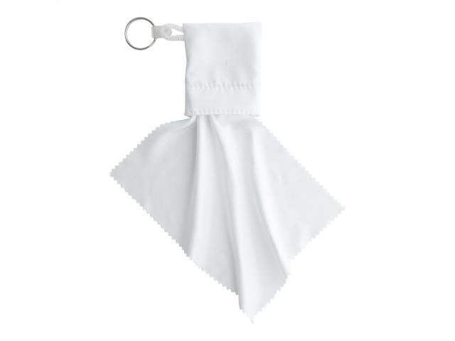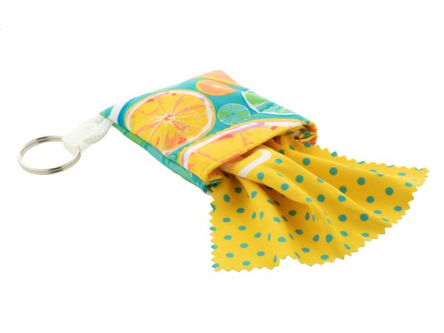 Custom made, microfibre (180 g/m²) cleaning cloth for glasses in polyester pouch with velcro closure and key ring. With all over sublimation printed graphics. MOQ: 100 pcs.