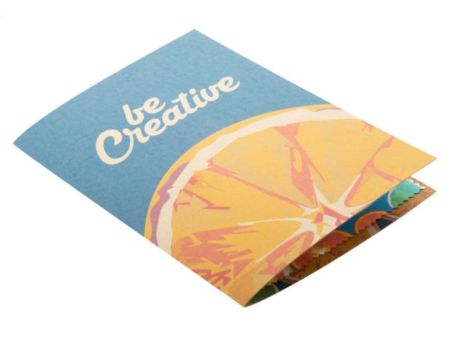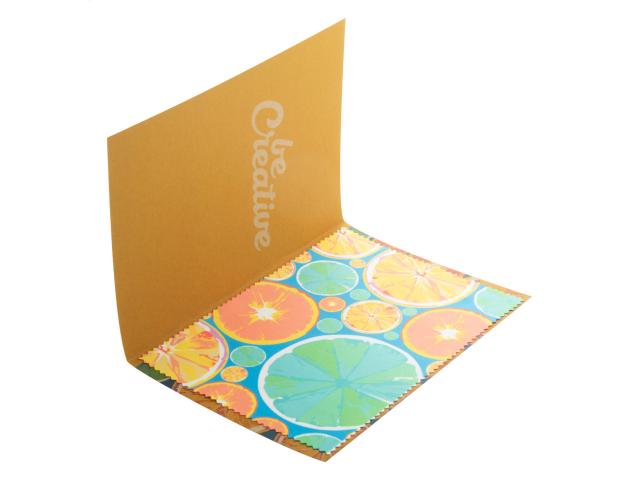 Custom made kraft paper postcard with custom graphic on both sides. Including a sublimation printed 100% RPET microfibre (170 g/m²) cleaning cloth for glasses. MOQ: 100 pcs.