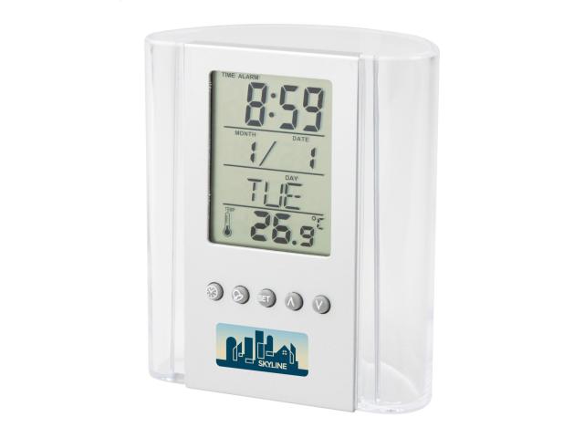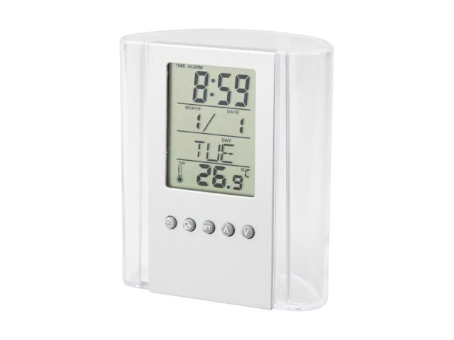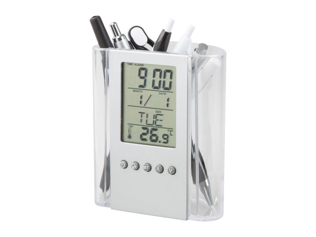 Transparent, plastic pen holder with digital display, thermometer, clock, alarm and calendar functions. Delivered with button cell battery.