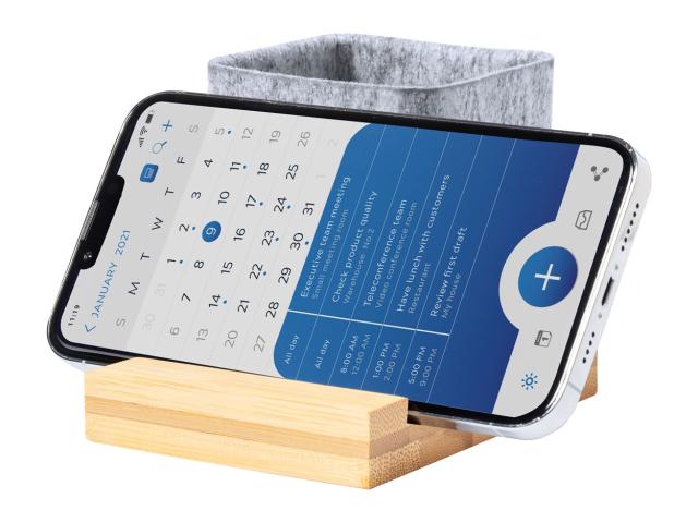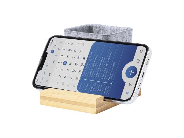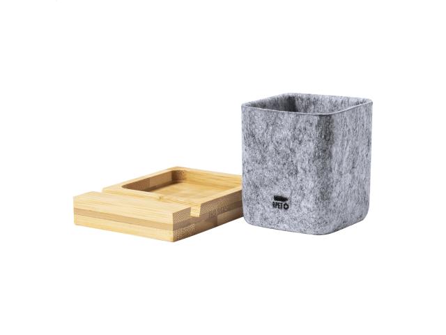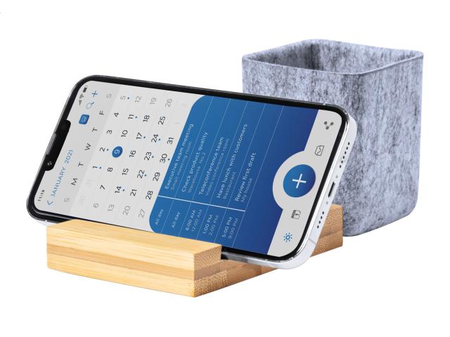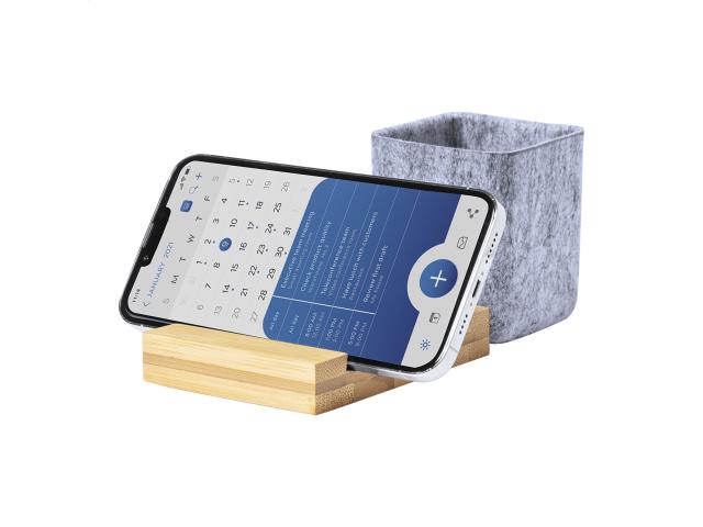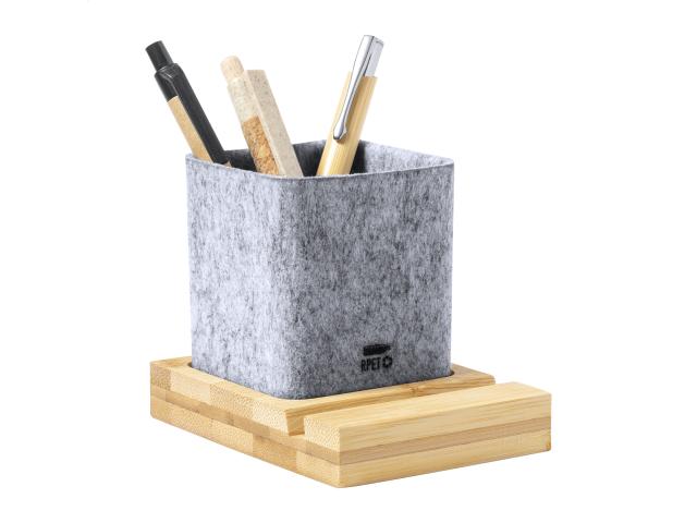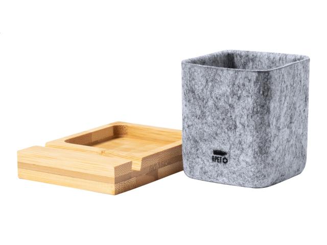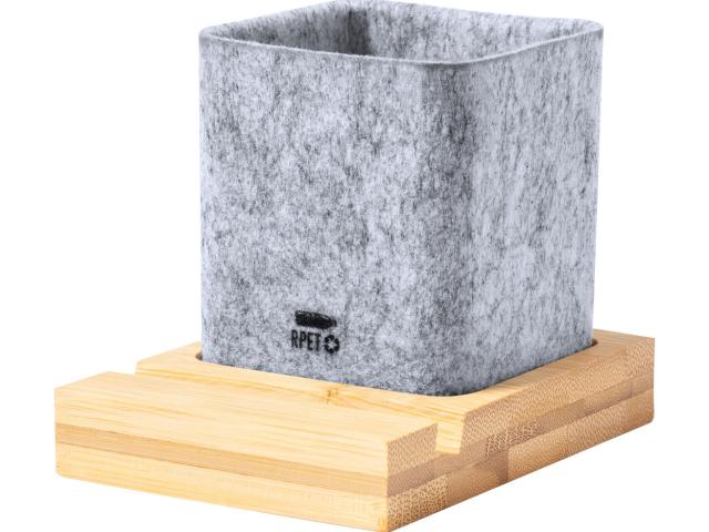 Bamboo desk organizer with mobile phone holder and RPET felt pen holder.