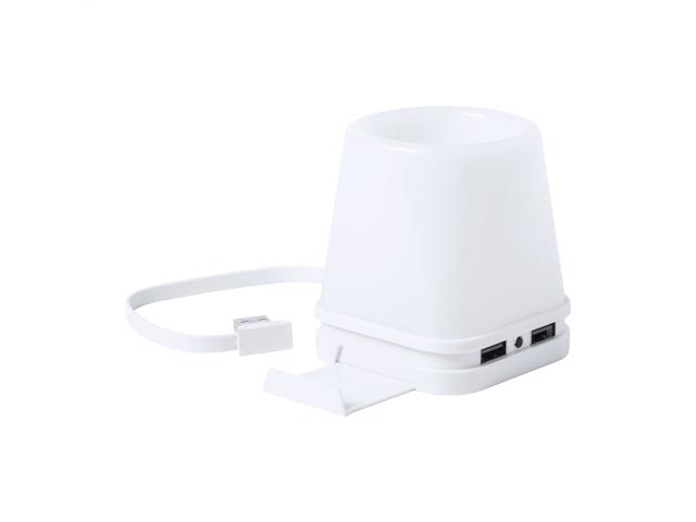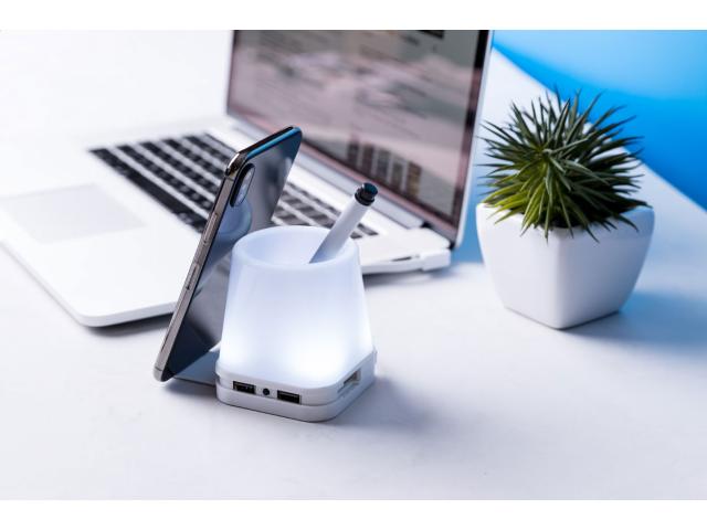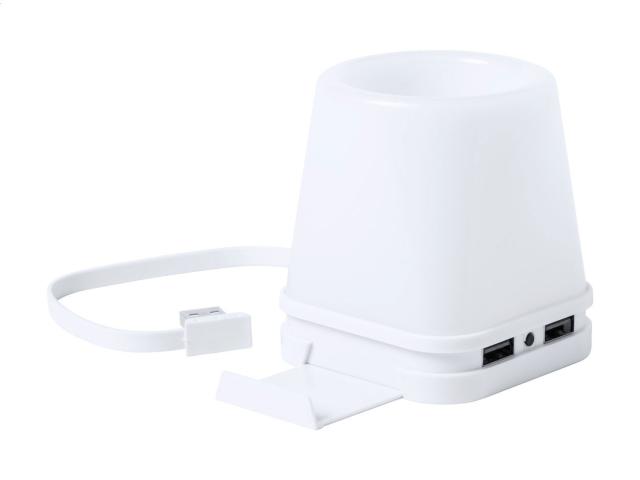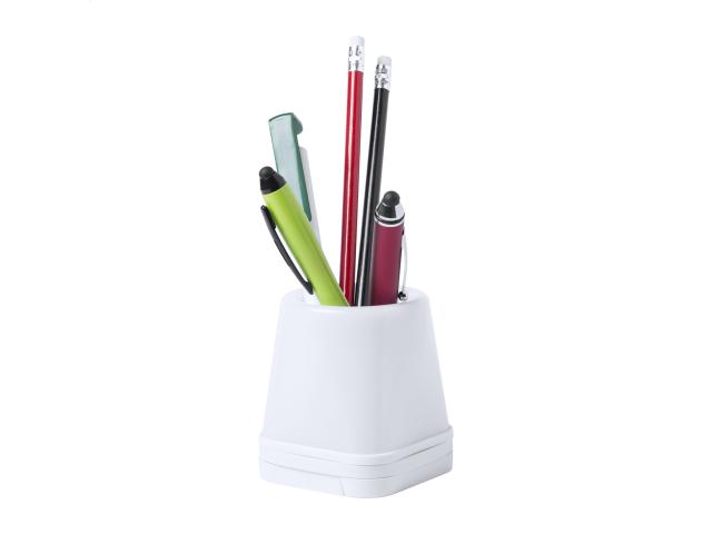 Plastic pen holder with 4-port USB hub, built-in mobile holder and 4 LED lights. USB 2.0.