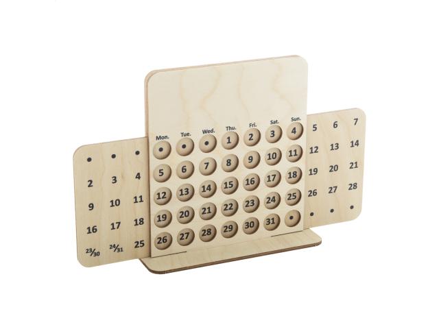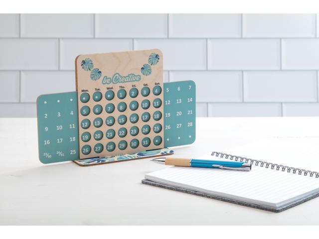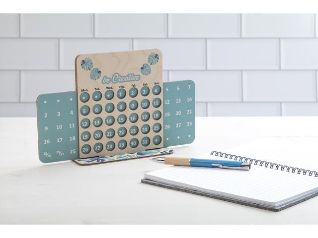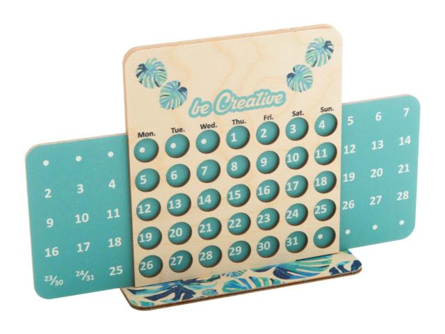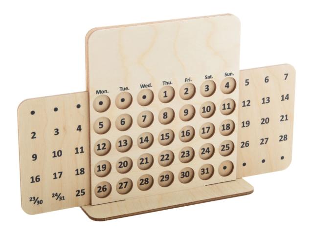 Custom made, perpetual desk calendar in birch plywood. Price includes full colour printing on front side and base. Delivered flat-packed. MOQ: 50 pcs.