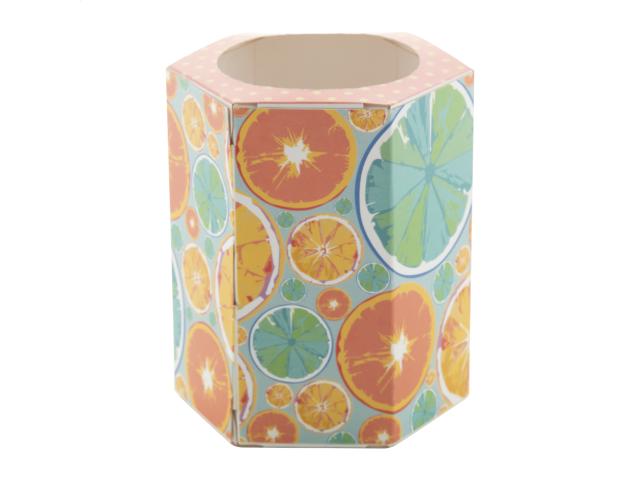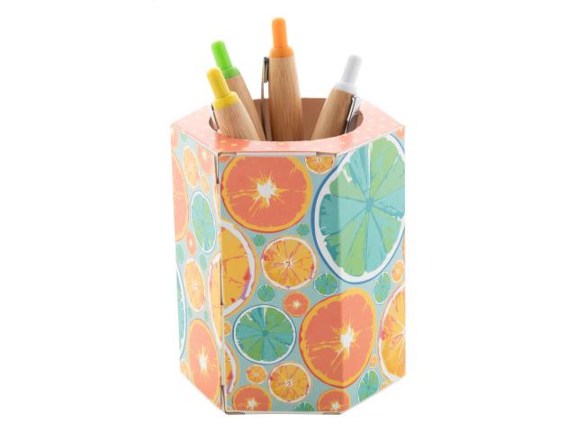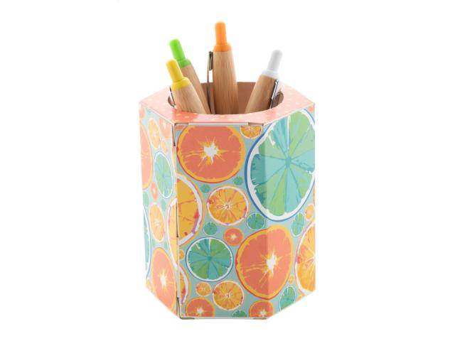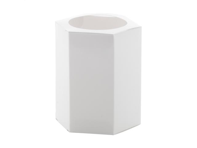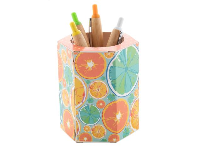 Custom made, hexagon shaped paper pen holder. Price includes full colour printing. MOQ: 100 pcs. Delivered flat-packed.
