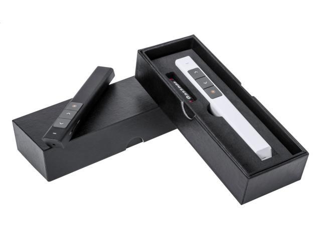 Plastic laser pointer with LED light and presentation remote function. In paper gift box. With 1 AAA battery.