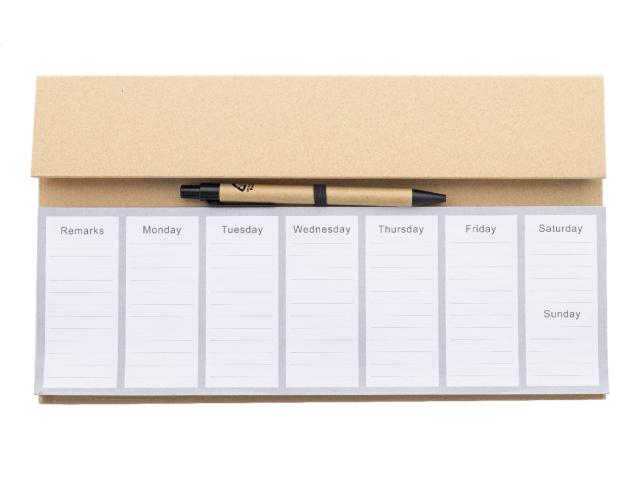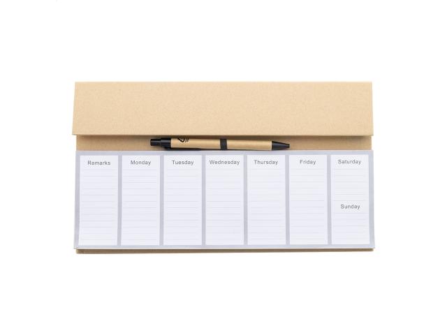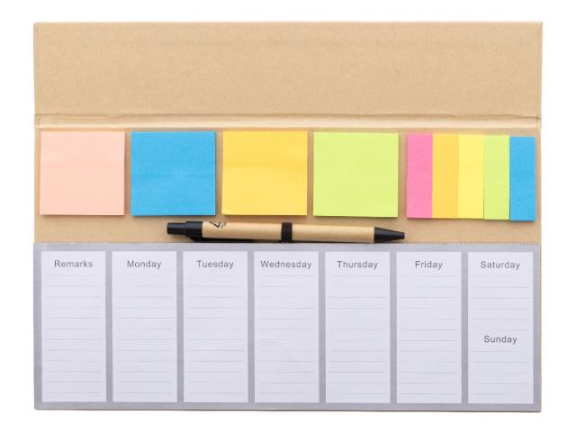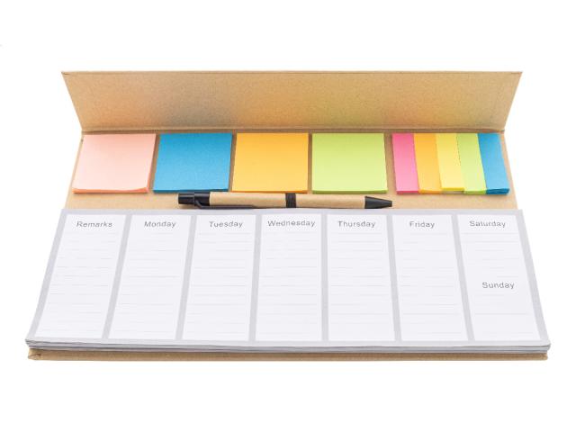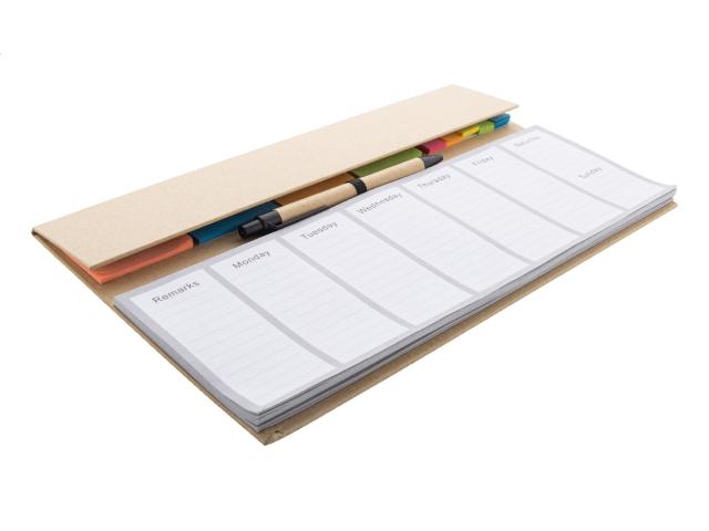 Recycled paper desktop calendar set with 50 undated weekly planner sheets, 100 sticky notes (in 4 colours) and 125 page markers (in 5 colours). Includes recycled paper ballpoint pen with blue refill.