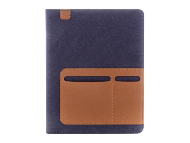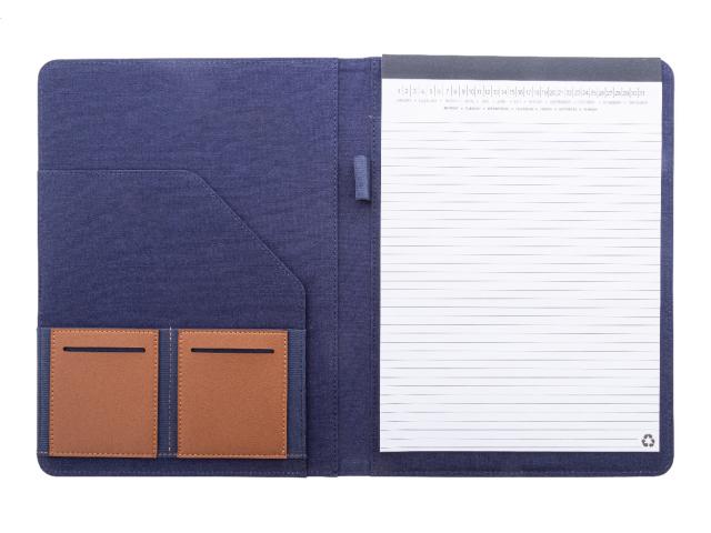 A4 sized, recycled canvas and recycled PU leather document folder with multiple front and inside organizer pockets. With 20 lined sheets notepad in recycled paper. 70% recycled cotton and 30% RPET polyester.