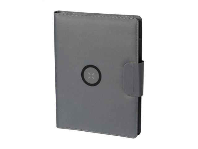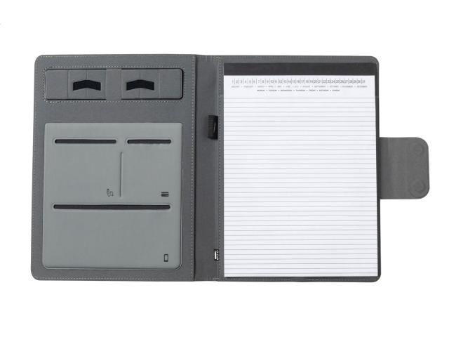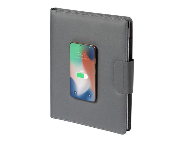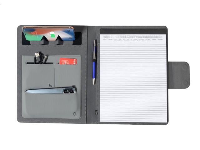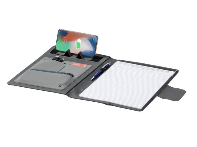 A4 sized, 300D RPET polyester document folder with built-in magnetic wireless fast charger (10W), 5000 mAh power bank with USB charger port, foldable mobile holder and 20 lined sheets notepad. Including self-adhesive metal ring to use the magnetic function on any wirelessly chargeable device. Including USB charger cable.