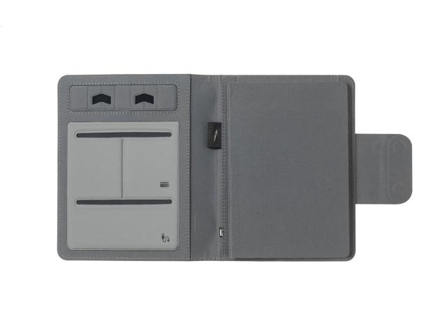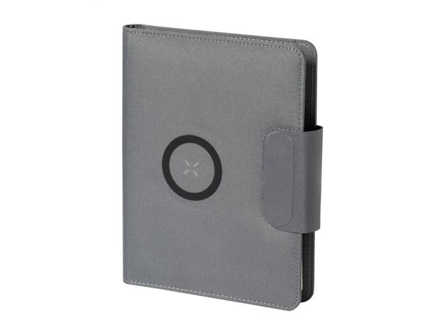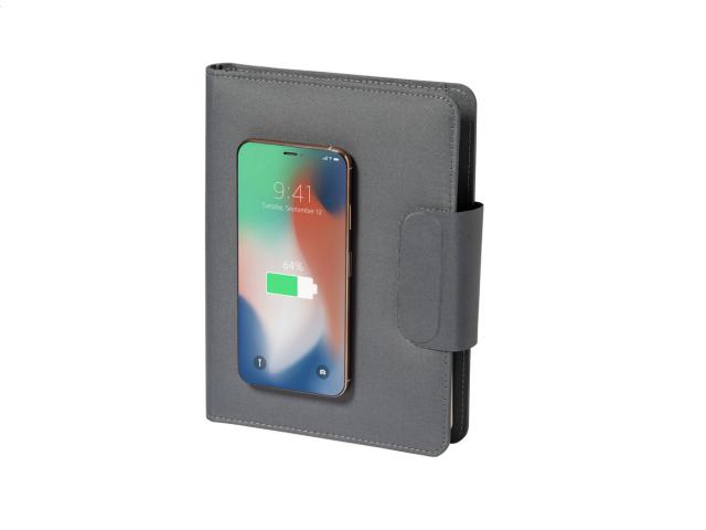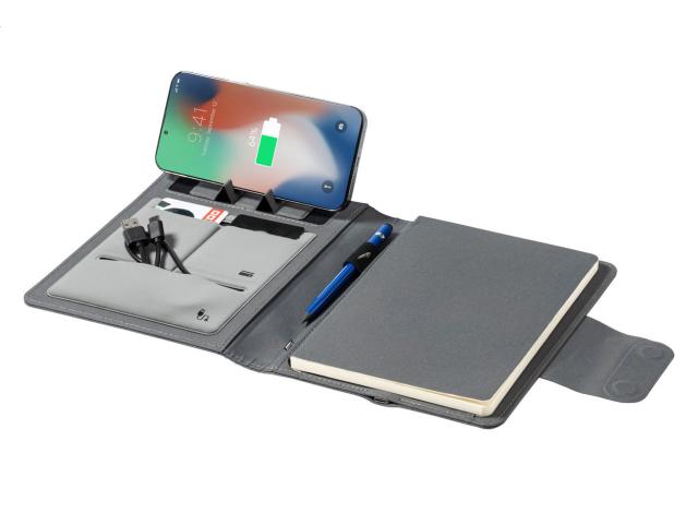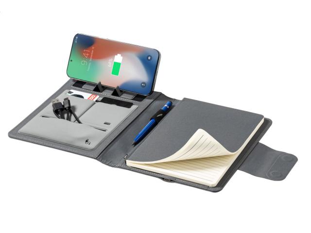 A5 sized, 300D RPET polyester document folder with 65 lined sheets notepad, built-in magnetic wireless fast charger (10W), 5000 mAh power bank with USB charger port, and foldable mobile holder. Including self-adhesive metal ring to use the magnetic function on any wirelessly chargeable device. Including USB charger cable.