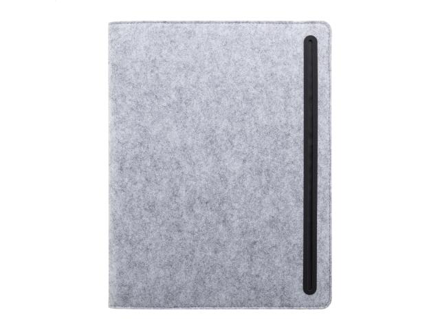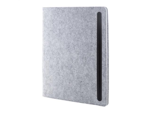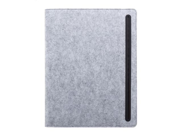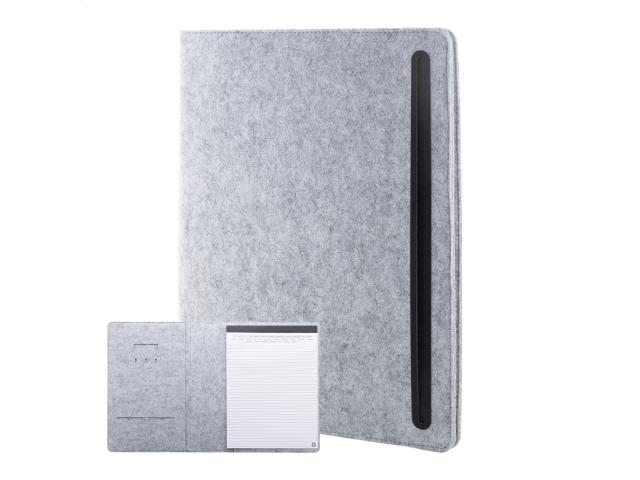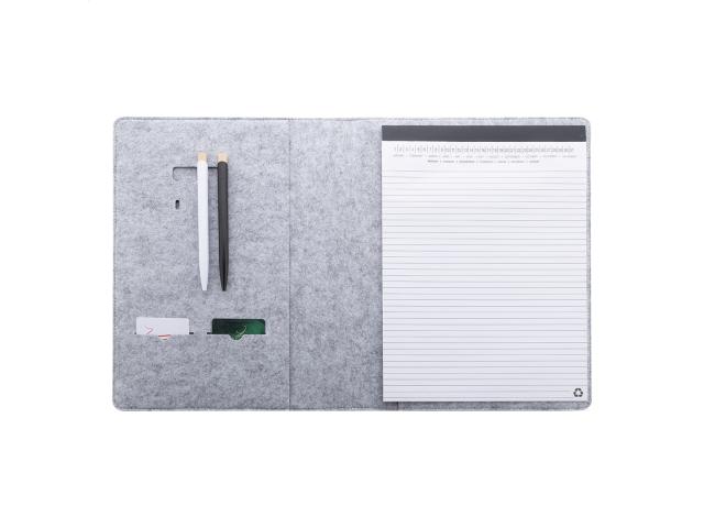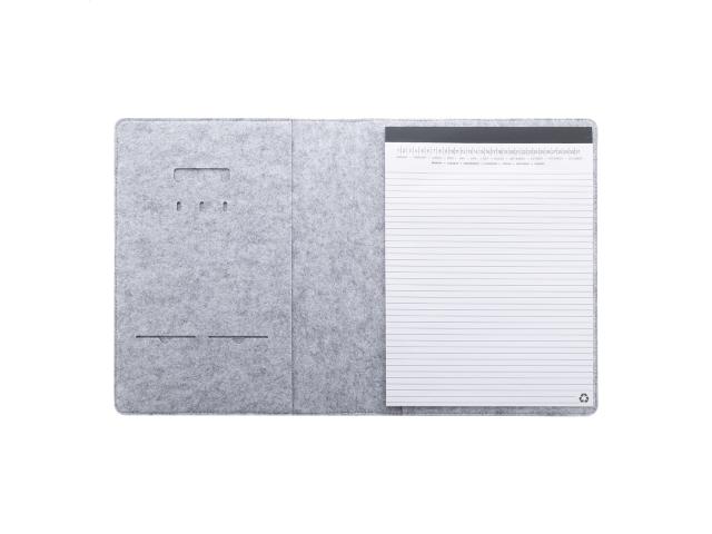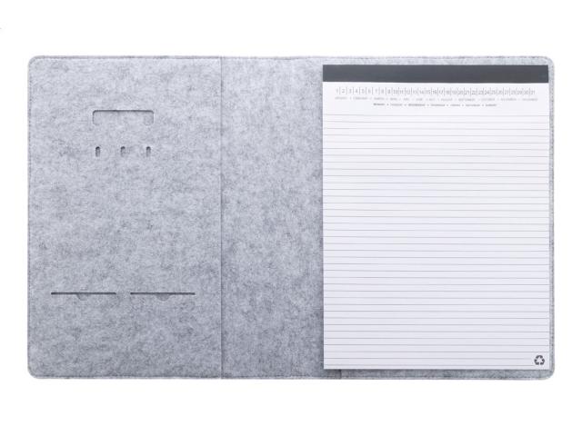 A4 sized, RPET felt document folder with front and multiple inside organizer pockets. With 20 lined sheets notepad in recycled paper.