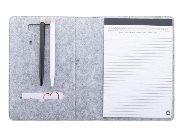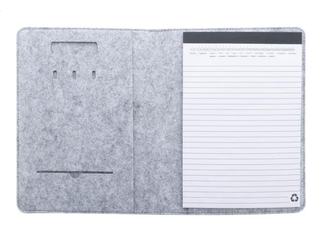 A5 sized, RPET felt document folder with front and multiple inside organizer pockets. With 20 lined sheets notepad in recycled paper.