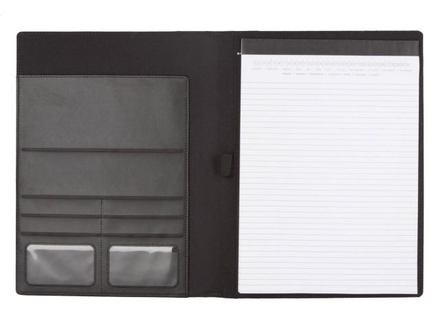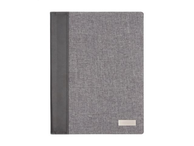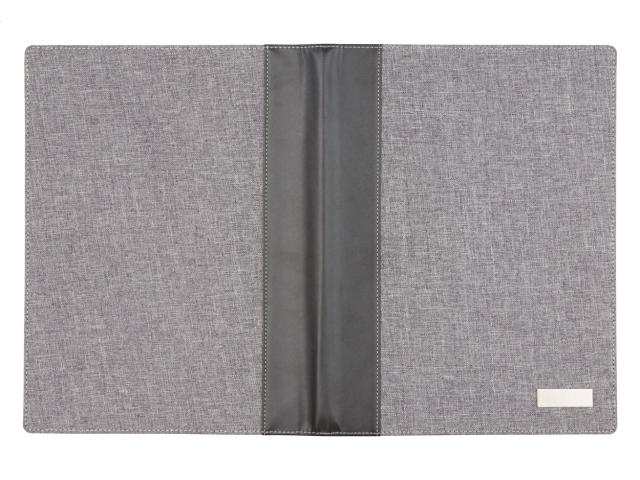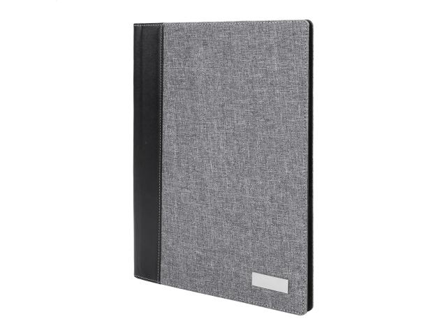 Linen and PU leather covered, A4 sized document folder with 20 lined sheets notepad and metal plate.