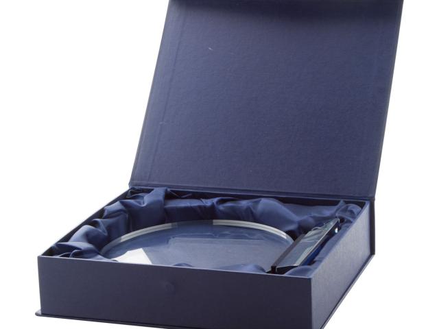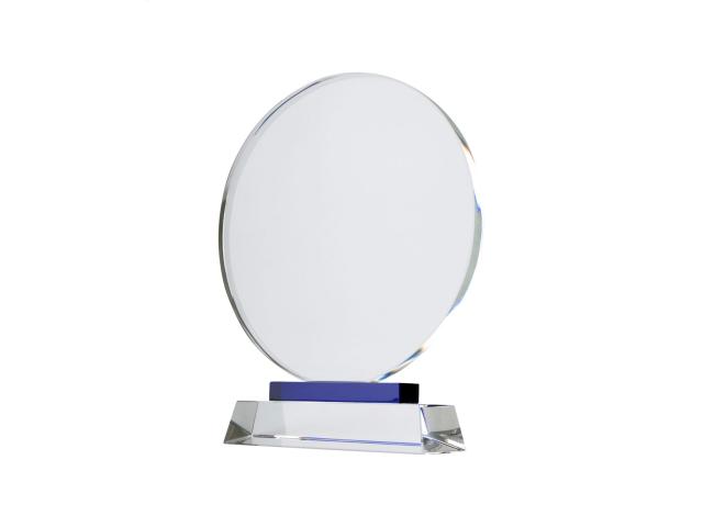 Round trophy with glass base. Delivered in blue, carton gift box with silk inlay and magnetic lock.