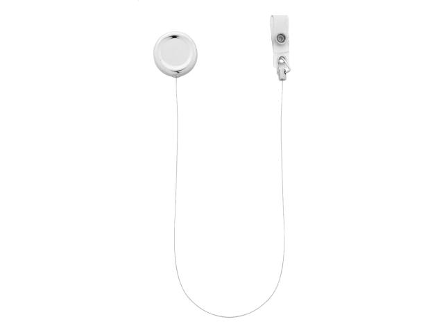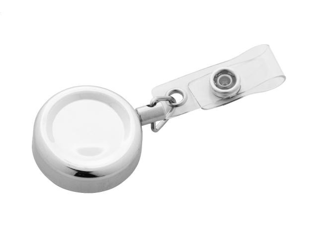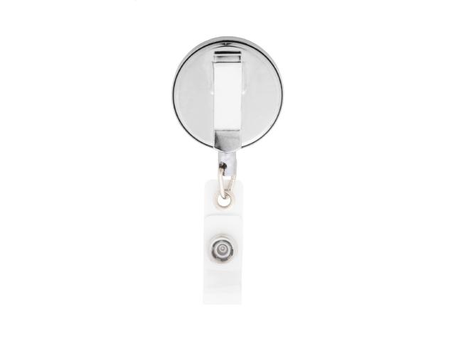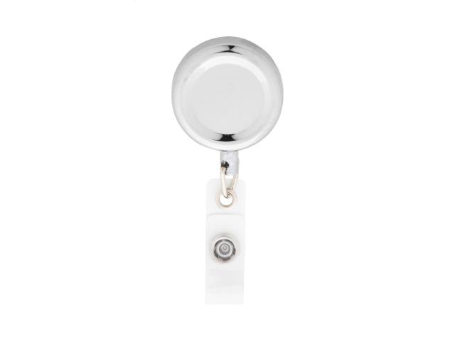 Exclusive metal badge holder with high gloss metallic finish. With press-stud closure, telescopic line and metal clip.