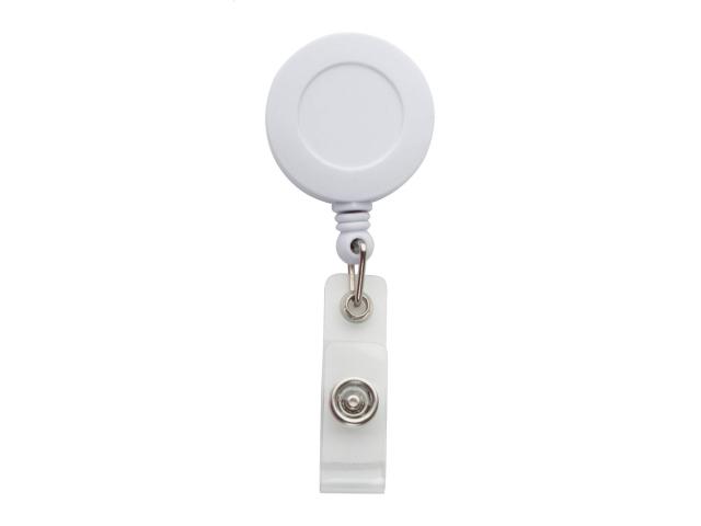 Plastic badge holder with press-stud closure, telescopic line and metal clip.