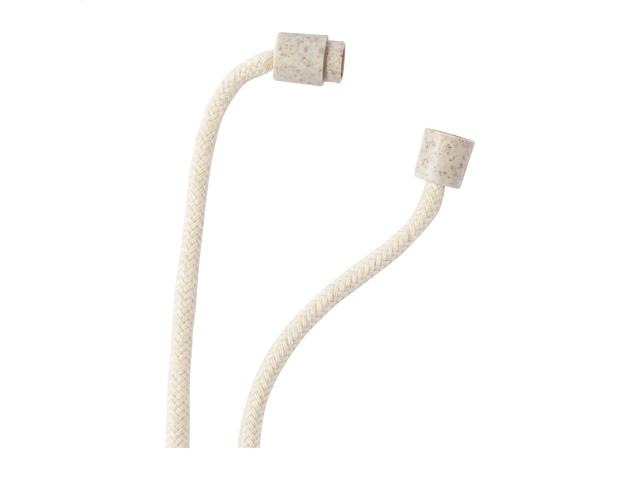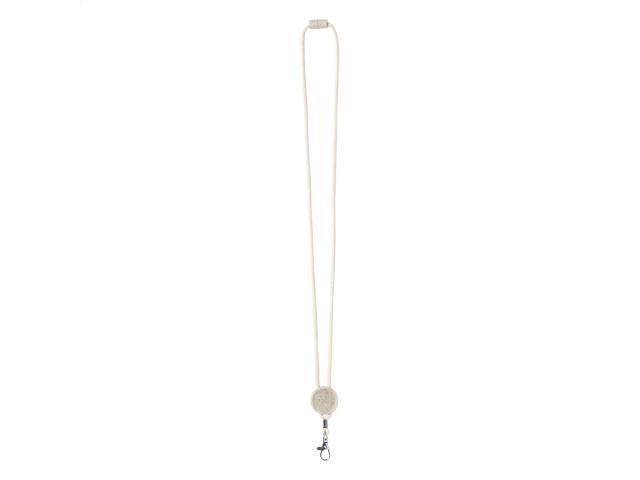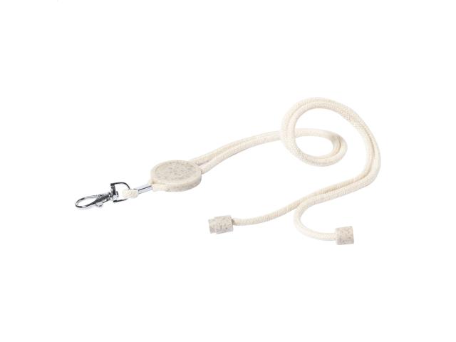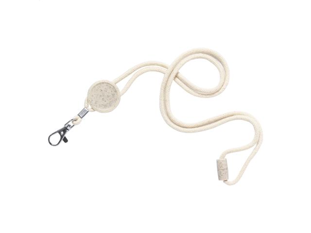 Cotton lanyard with metal carabiner, safety buckle and round tag in ecological wheat straw and ABS plastic. Ideal for epoxy doming.