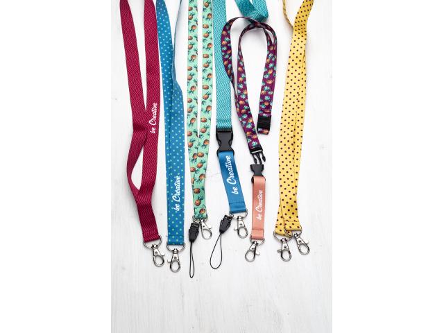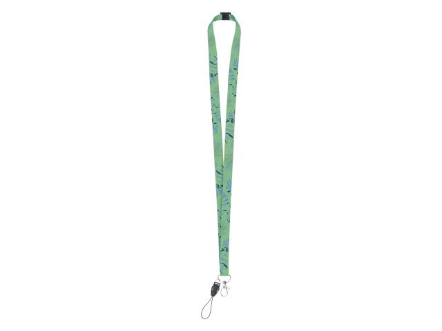 Custom made, 15 mm wide polyester lanyard with metal carabiner, mobile string and safety buckle. With sublimation printed graphics on both sides. MOQ: 100 pcs.
