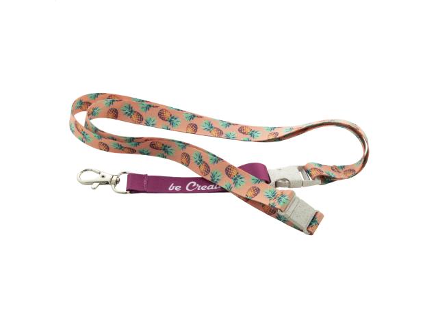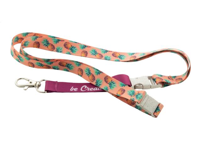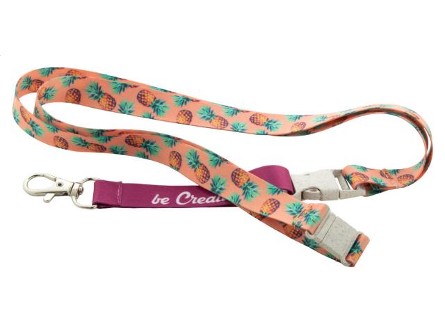 Custom made, 15 mm wide RPET lanyard with detachable metal carabiner and wheat straw plastic safety buckle. With sublimation printed graphics on both sides. MOQ: 100 pcs.
