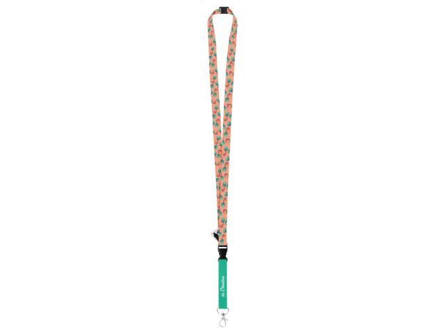 Custom made, 15 mm wide RPET lanyard with detachable metal carabiner and safety buckle. With sublimation printed graphics on both sides. MOQ: 100 pcs.