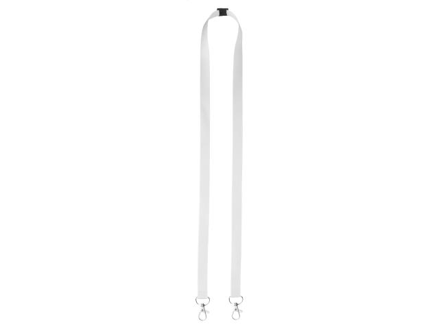 Custom made, 15 mm wide polyester lanyard with 2 metal carabiners and safety buckle. With sublimation printed graphics on both sides. MOQ: 100 pcs.