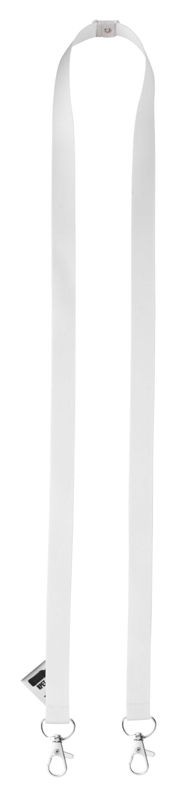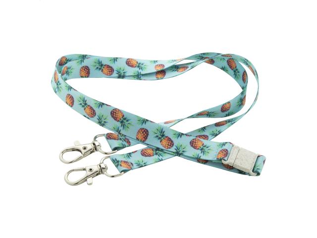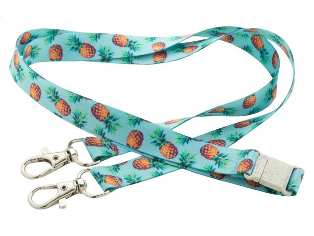 Custom made, 15 mm wide RPET lanyard with 2 metal carabiners and wheat straw plastic safety buckle. With sublimation printed graphics on both sides. MOQ: 100 pcs.
