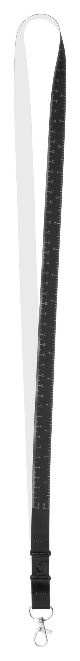 Custom made, 15 mm wide polyester lanyard with 100 cm tape measure and metal carabiner. With sublimation printed graphics on one side. MOQ: 100 pcs.