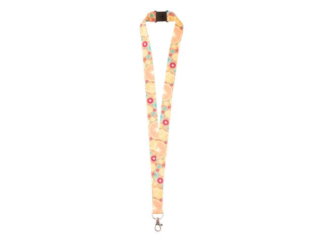 Custom made, polyester lanyard with metal carabiner and safety buckle. With sublimation printed graphics on both sides. MOQ: 100 pcs.