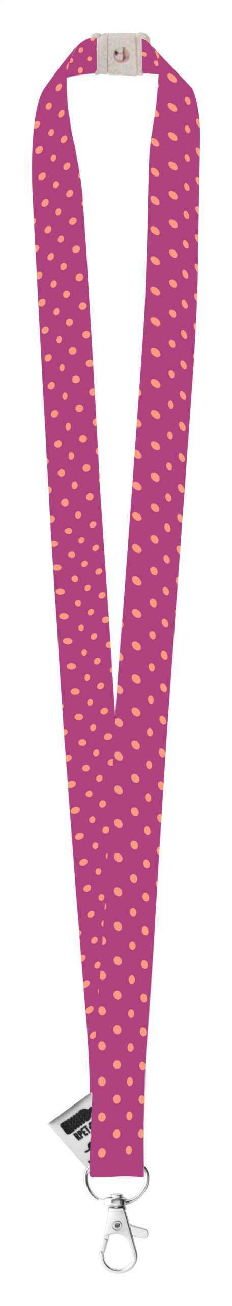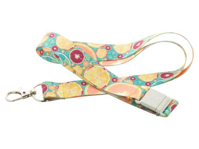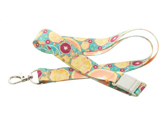 Custom made, RPET lanyard with metal carabiner and wheat straw plastic safety buckle. With sublimation printed graphics on both sides. MOQ: 100 pcs.
