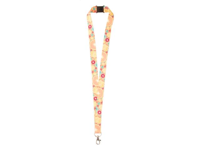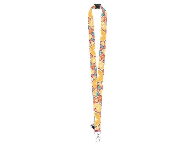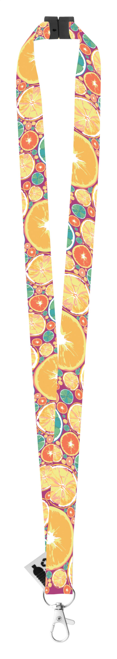 Custom made, RPET lanyard with metal carabiner and safety buckle. With sublimation printed graphics on both sides. MOQ: 100 pcs.